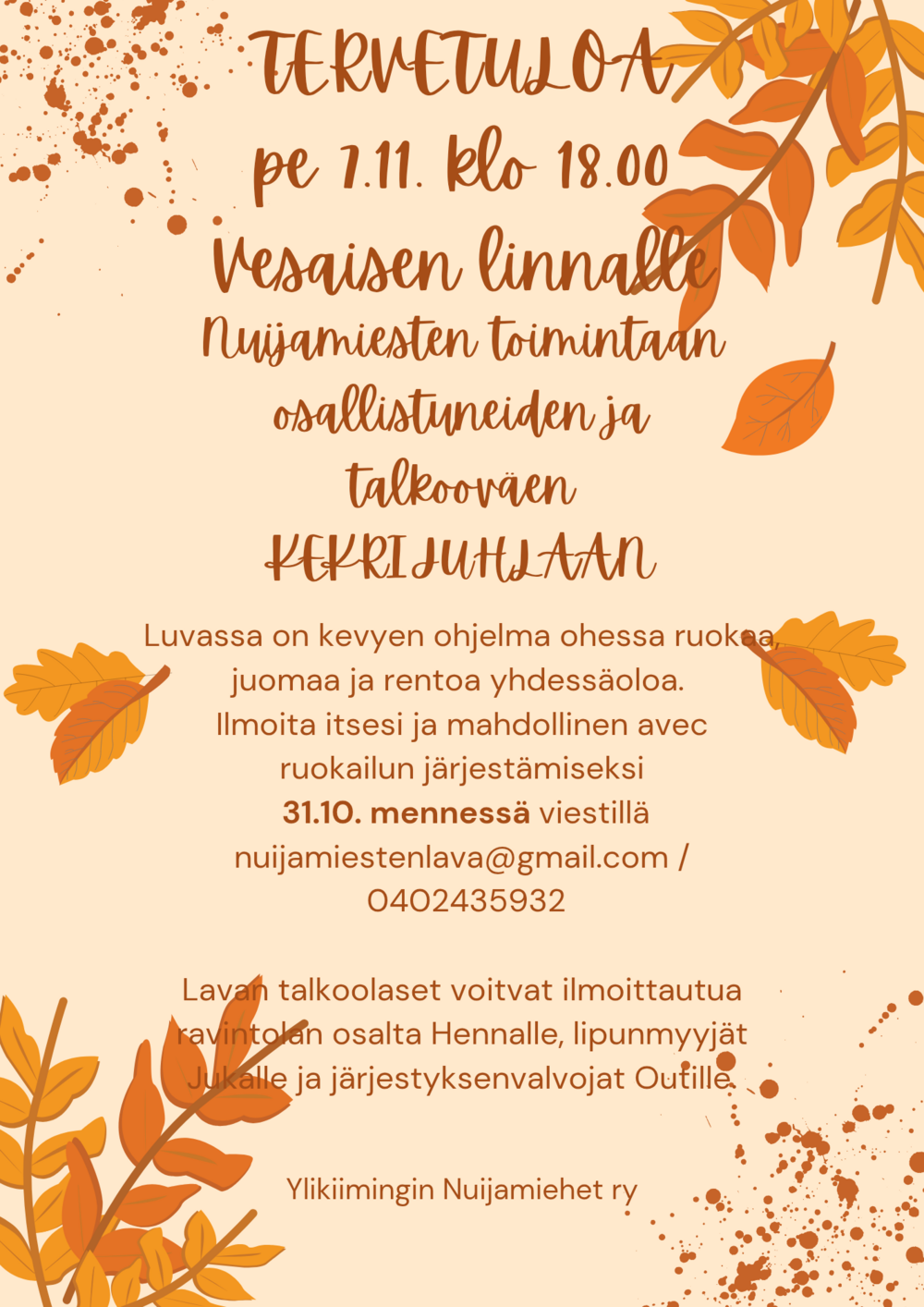 Perjantaina 10.11.2023 vietettiin Vesaisenlinnalla Nuijamiesten toiminnassa mukana olleille kekrijuhlaa kiitoksena kuluneen kauden toiminnasta. Paikalla oli noin 100 urheilun ja tanssilavan toimijaa, kiitokset kaikille paikalla olleille mukavasta illasta 🧡