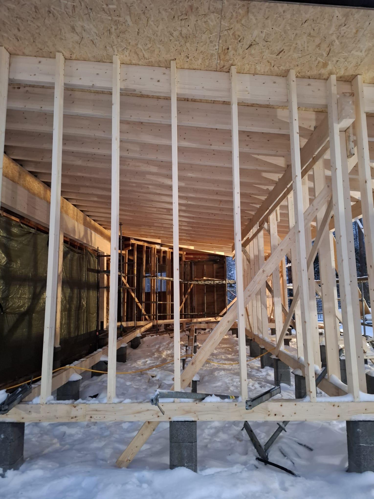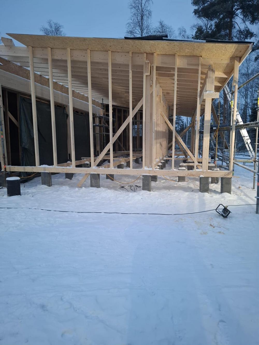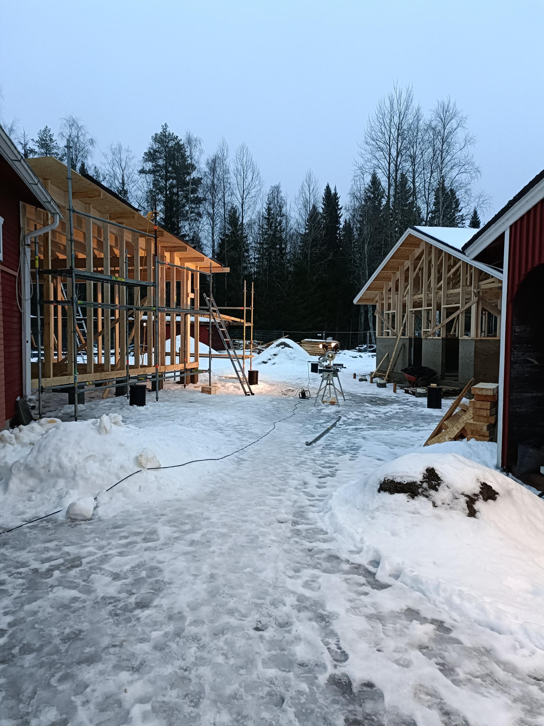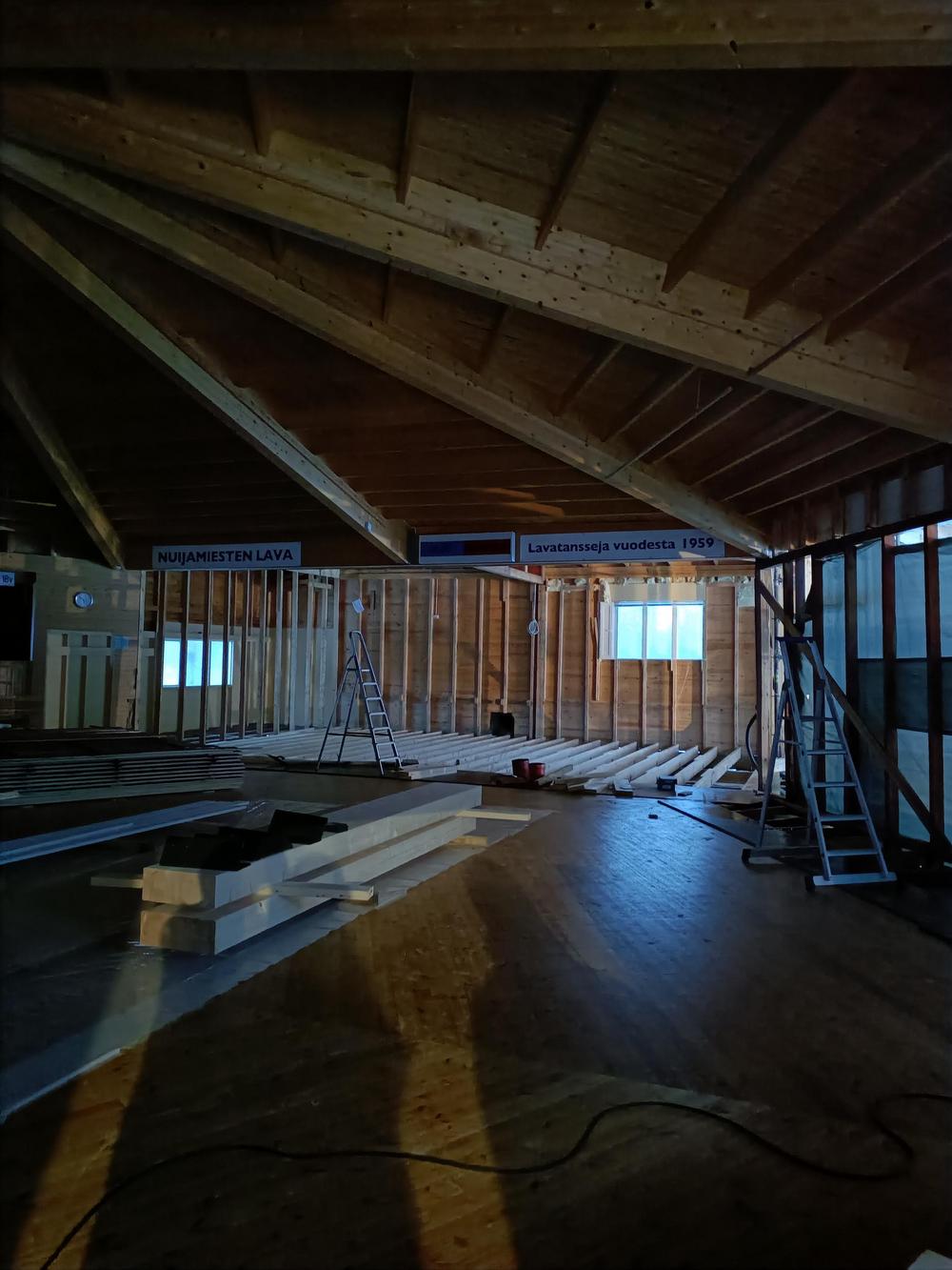 Lunta ja loskaakin on riittänyt, mutta remonttihanke Nuijamiesten lavalla etenee hyvin aikataulussaan. WC-rakennuksen ja uuden esiintymislavan päällä on jo katot, seuraavaksi siirrytään seinien pariin, jotta lumi ei pääse sisälle.