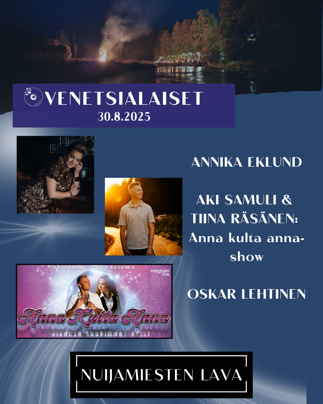La 30.8. Nuijamiesten lavan tanssikausi huipentuu Venetsialaisiin! Menot klo 20 - 0.45, liput 25€ (alle 18v 10€)